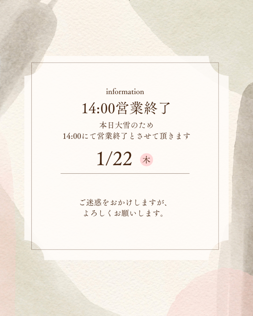 大雪の影響を受けまして、14:00にて営業終了とさせて頂きます