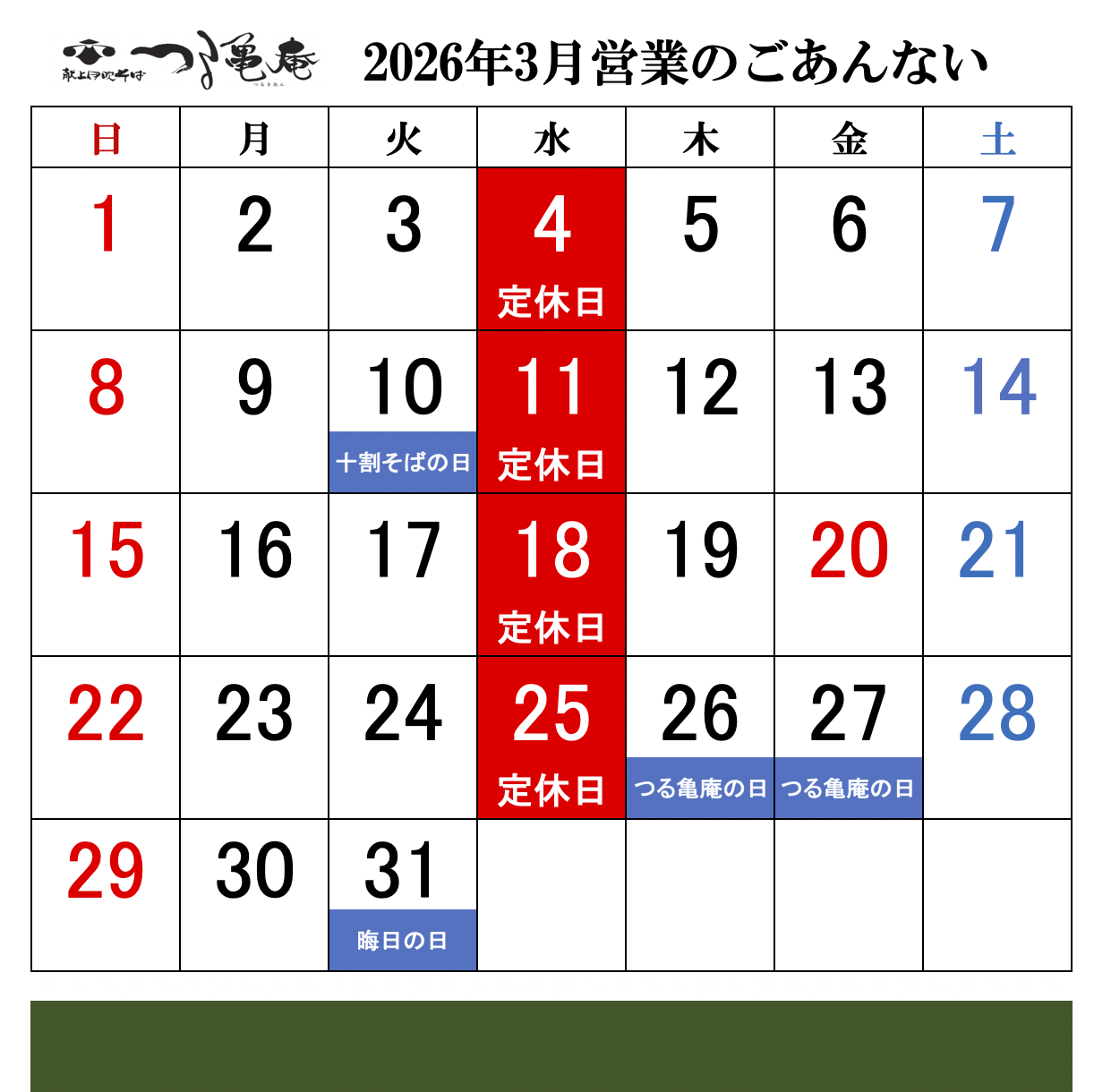 【つる亀庵 2026年4月 営業日のご案内】 2026年4月 […]
